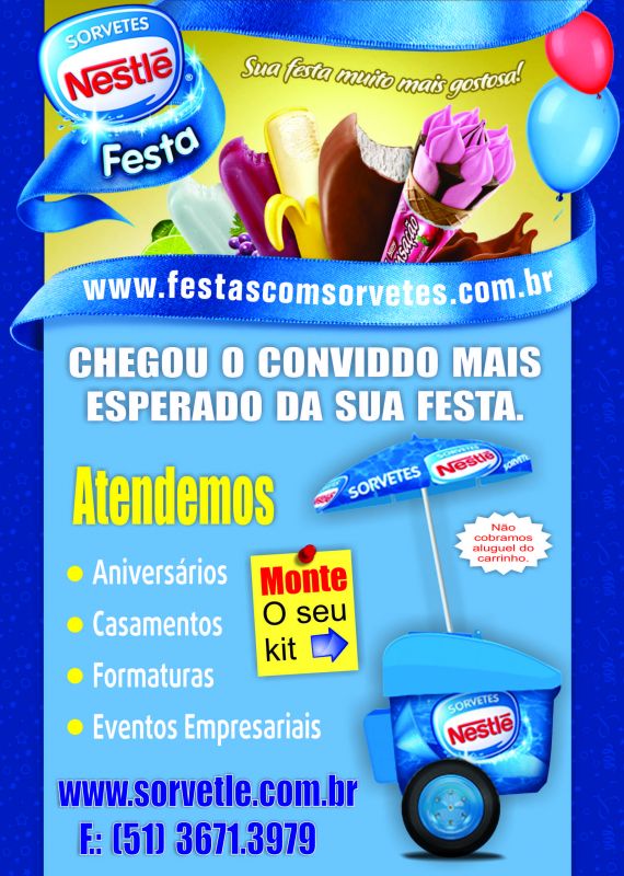 Você tem a festa e nós temos o carrinho com picolés/sorvetes Nestlé, para abrilhantar ainda mais seu evento. Neste seguimento Festa Nestlé, atendemos as regiões de Porto Alegre, Grande Porto Alegre, Centro-sul e Serra Gaúcha.